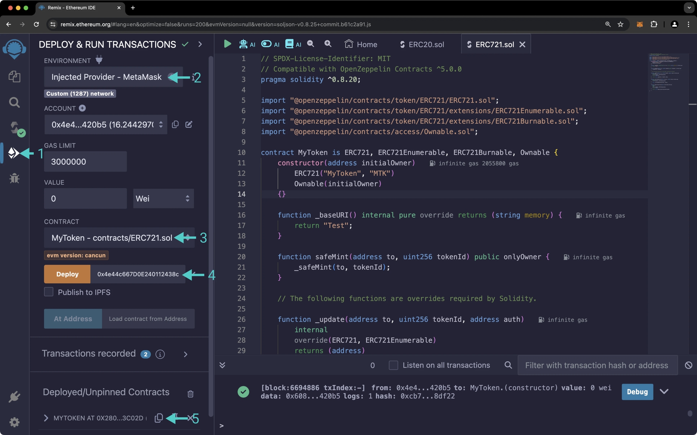 And that is it! You've deployed an ERC-721 token contract using OpenZeppelin's contracts and libraries. Next, you can interact with your token contract via Remix, or add it to MetaMask.
