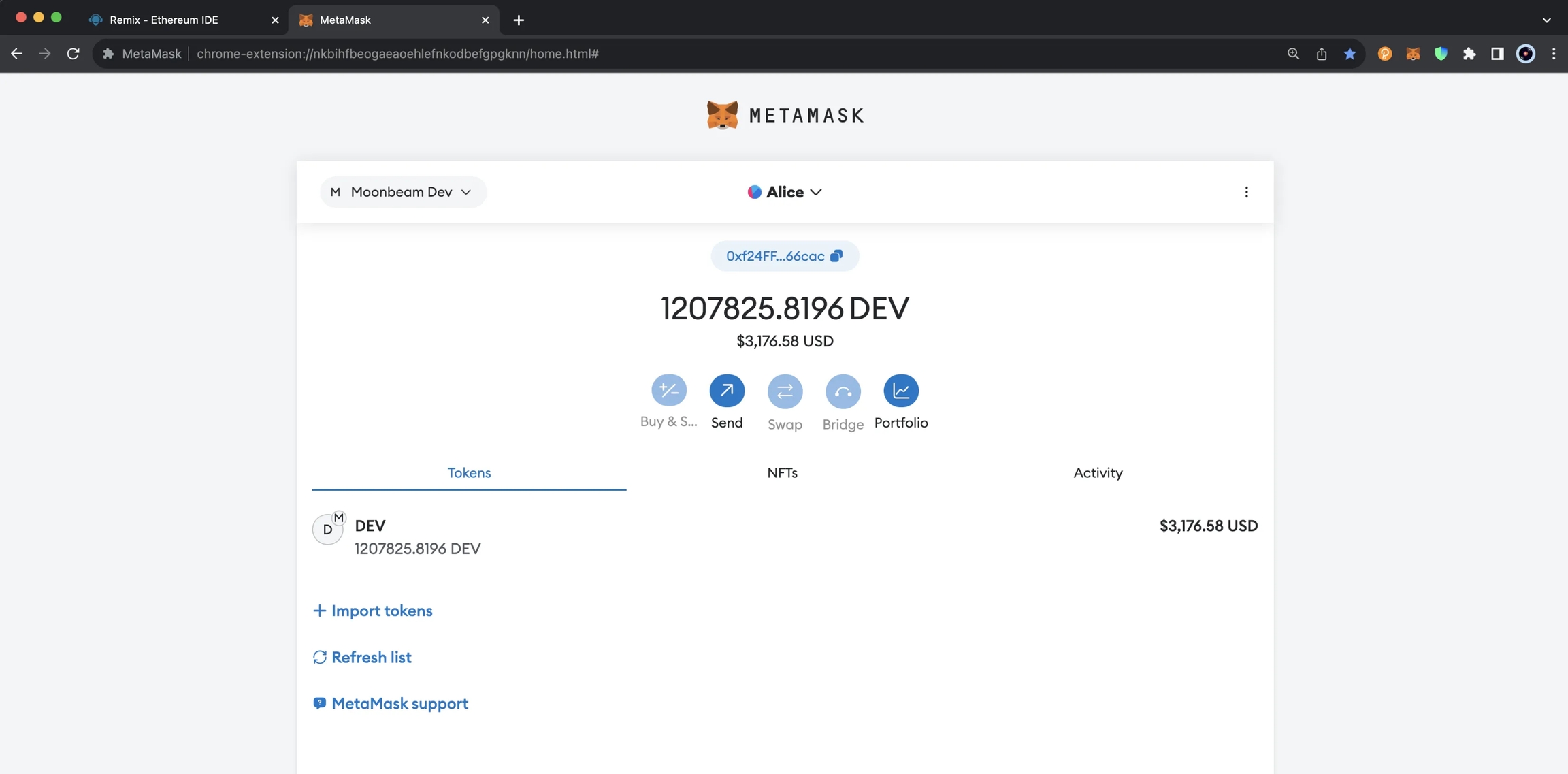 If you're adapting this guide for Phron, make sure you are connected to the correct network and have an account with funds. You can get DEV tokens for testing on Phron once every 24 hours from the Phron Faucet.