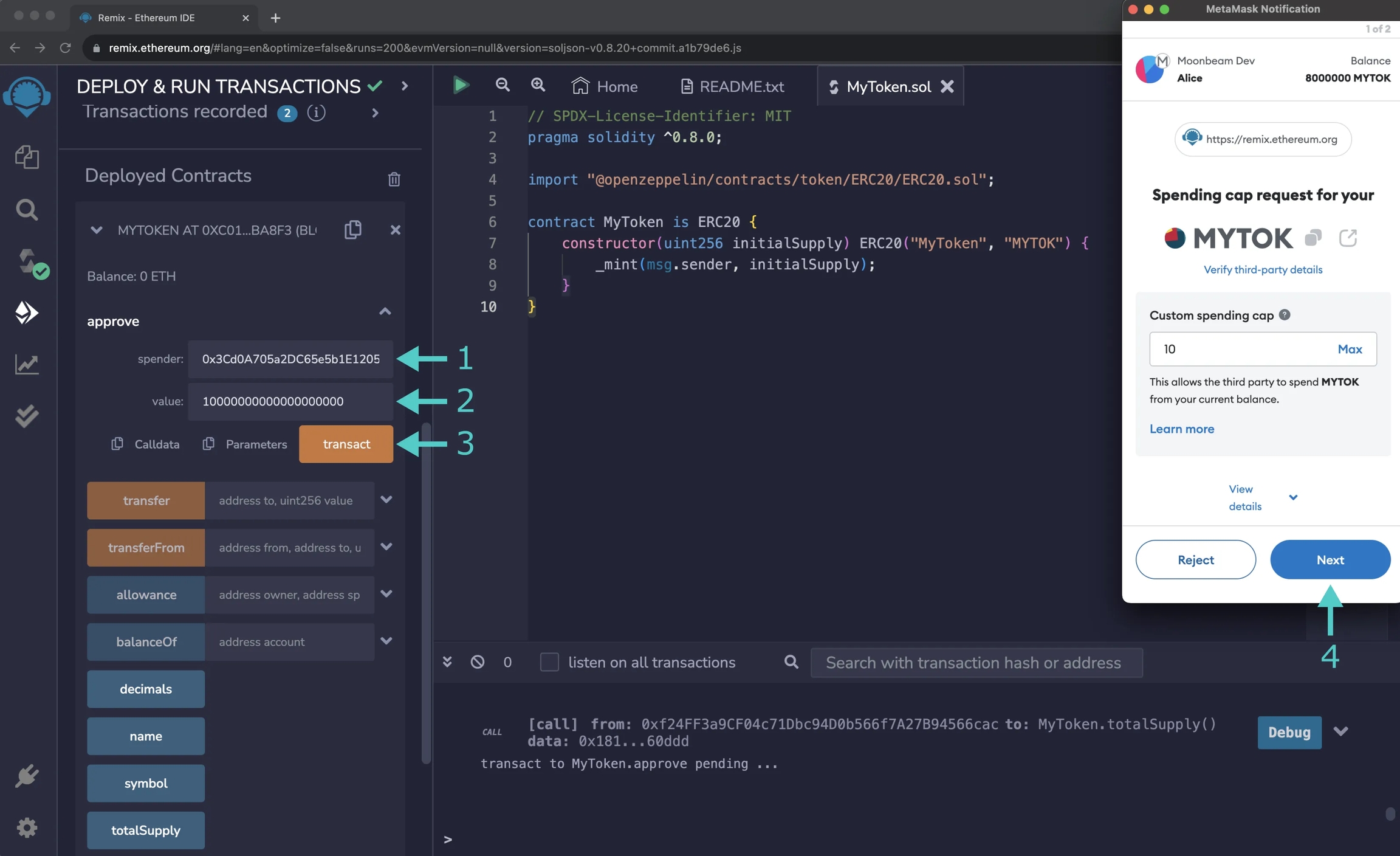 On the other hand, if you call the approve function, which will approve an account as a spender of a given amount of MYTOK tokens, you'll need to submit the approval in MetaMask. To test this out, you can take the following steps: