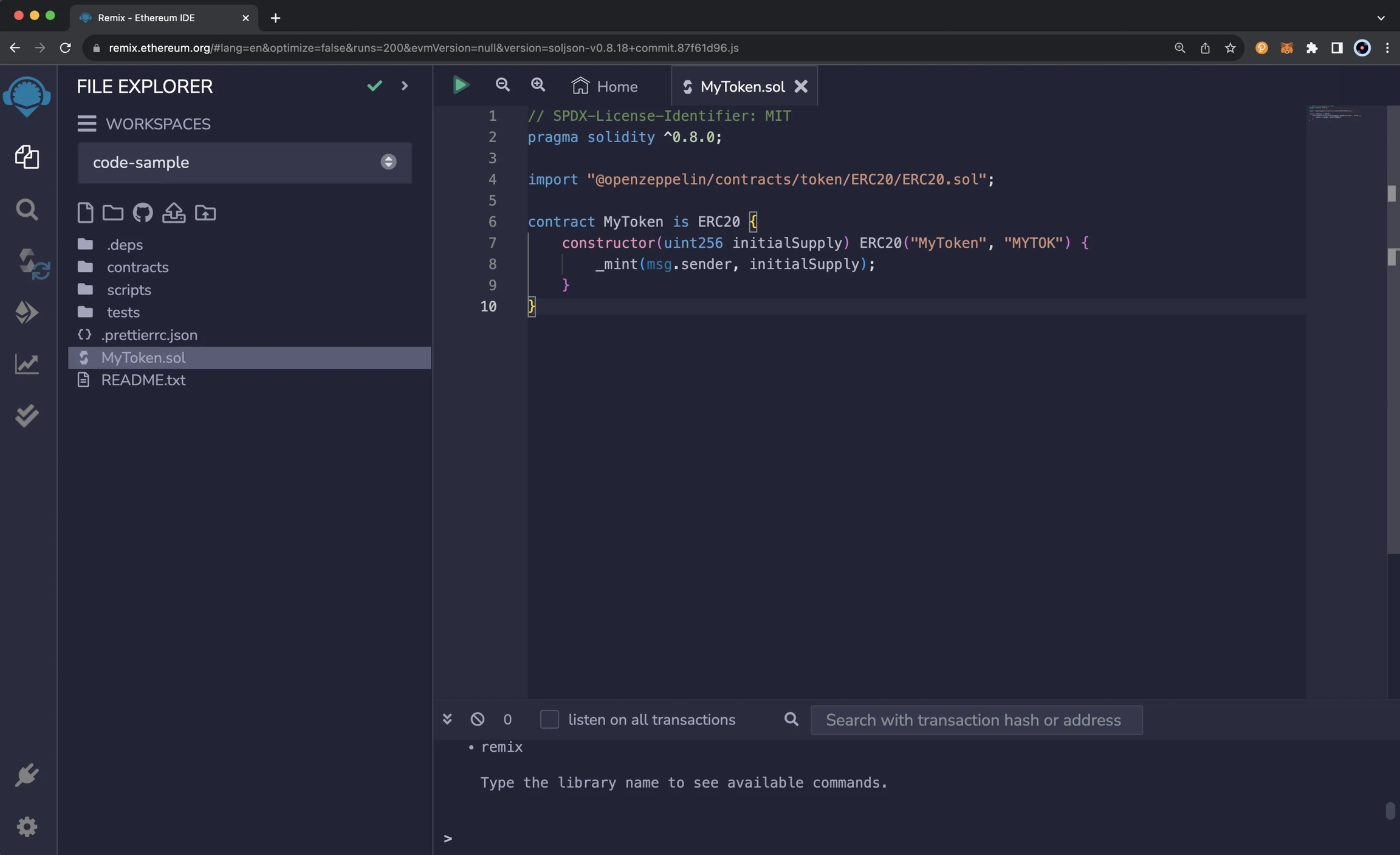 For this example, you will create a new file that contains an ERC-20 token contract. This will be a simple ERC-20 contract based on the current OpenZeppelin ERC-20 template. The contract will create a MyToken token with the MYTOK symbol that mints the entirety of the initial supply to the creator of the contract.