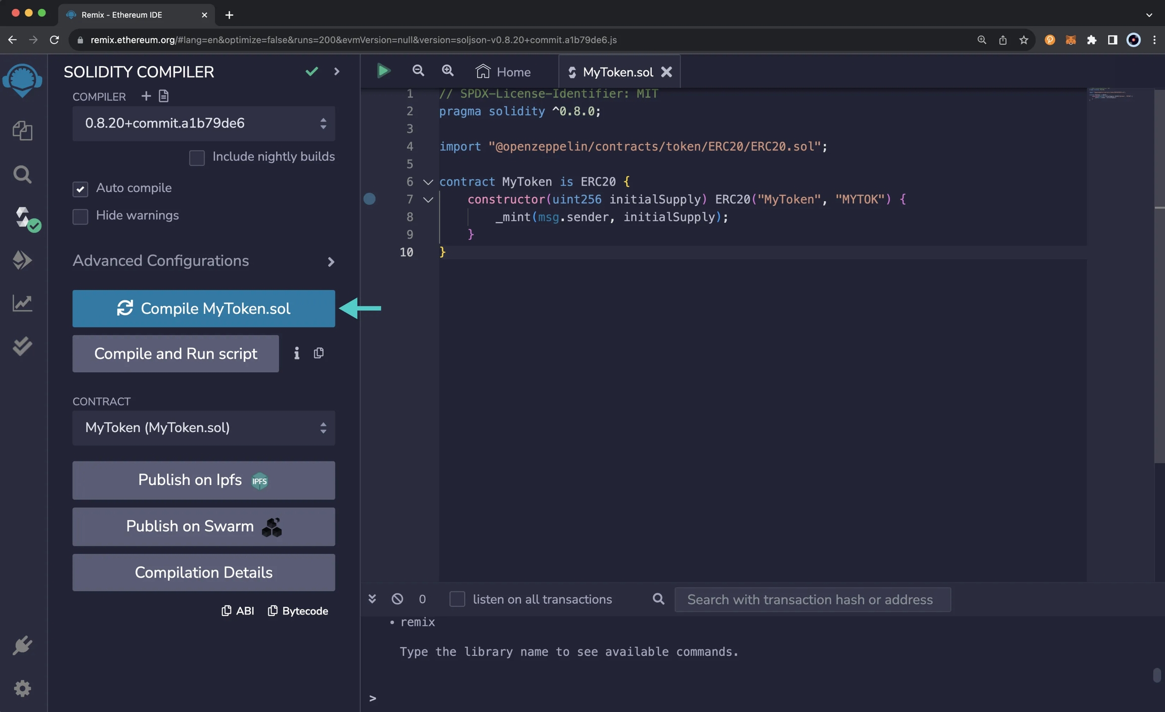 For this example, no additional configurations are needed. To compile the MyToken.sol contract, simply click on the Compile MyToken.sol contract. If the compilation was successful, you'll see a green check mark appear on the plugin panel next to the Solidity compiler plugin.