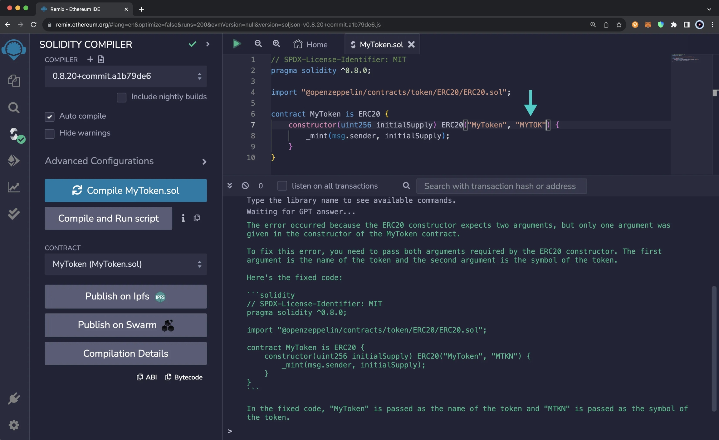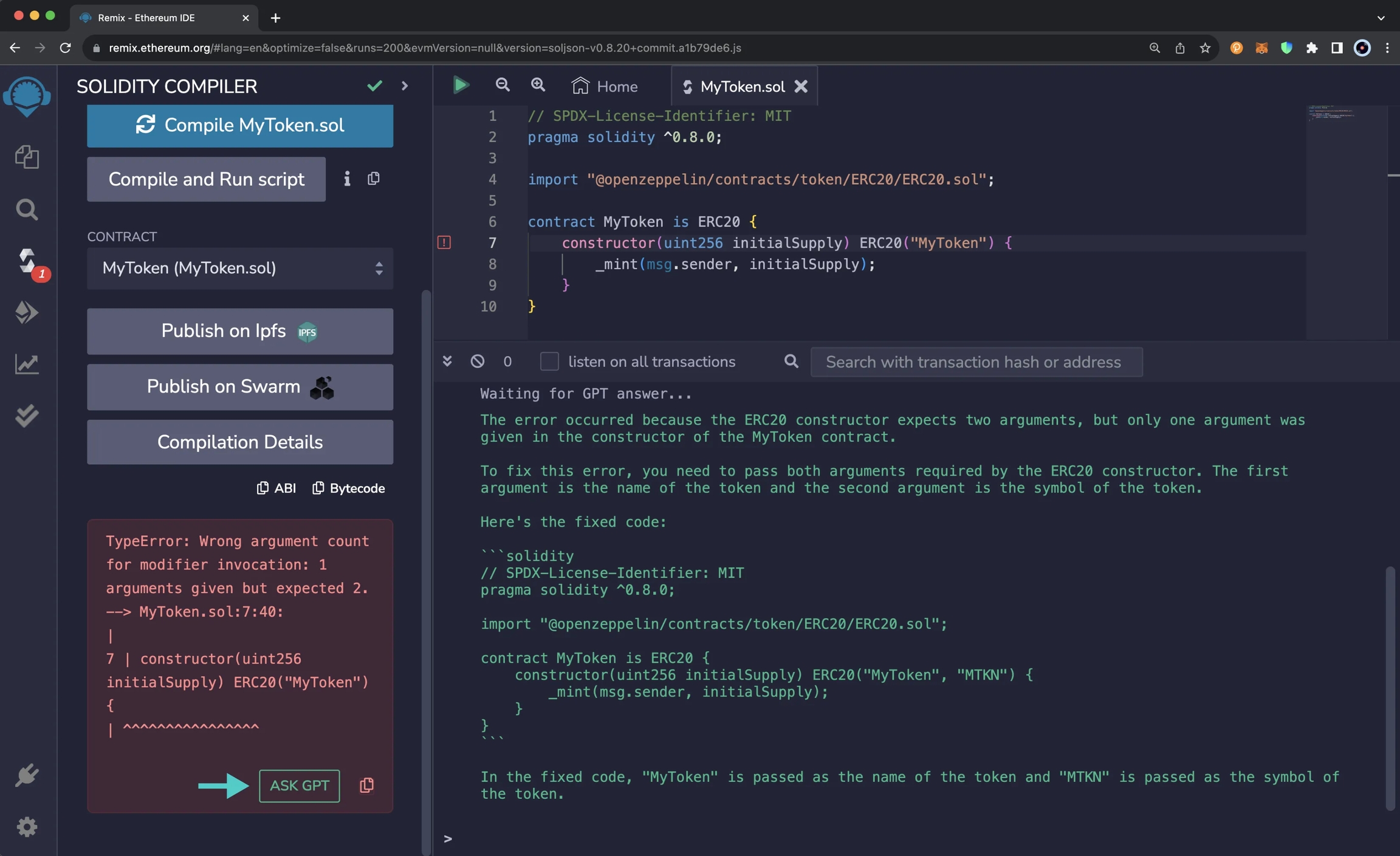 For example, if you only provided the token name to the ERC-20 constructor but forgot the token symbol and tried to compile the contract, an error would appear in the side panel. You can scroll down to read the error, and you'll see that there is also an ASK GPT button. To get help debugging the issue, you can click on ASK GPT, and a response will be returned in the Remix terminal that will guide you in the right direction to try and fix the issue. If you need additional help, you can go straight to the source and ask ChatGPT directly.
