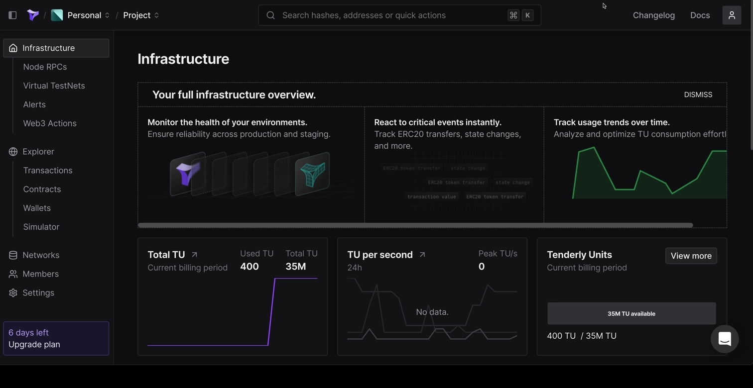 The Tenderly dashboard provides access to the all-in-one Web3 development platform. To get started with the dashboard, you'll need to sign up for an account. Once you've signed up, you'll be able to start exploring your Tenderly dashboard.