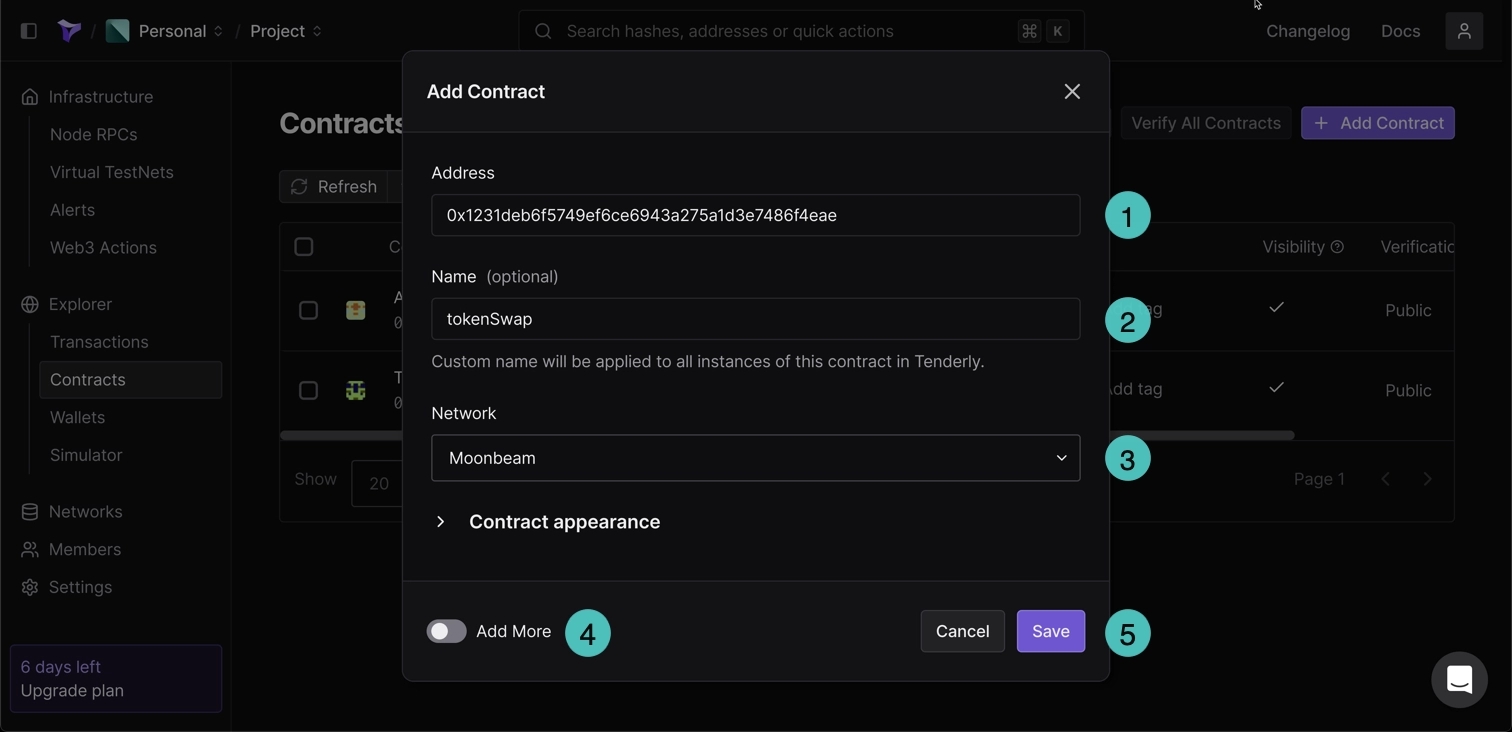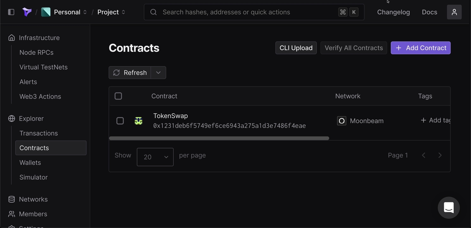 A good place to start with the Tenderly dashboard is to add a deployed smart contract. Once you've added a contract, you'll be able to create transaction simulations and forks, use the debugger, set up monitoring and alerts, and more.