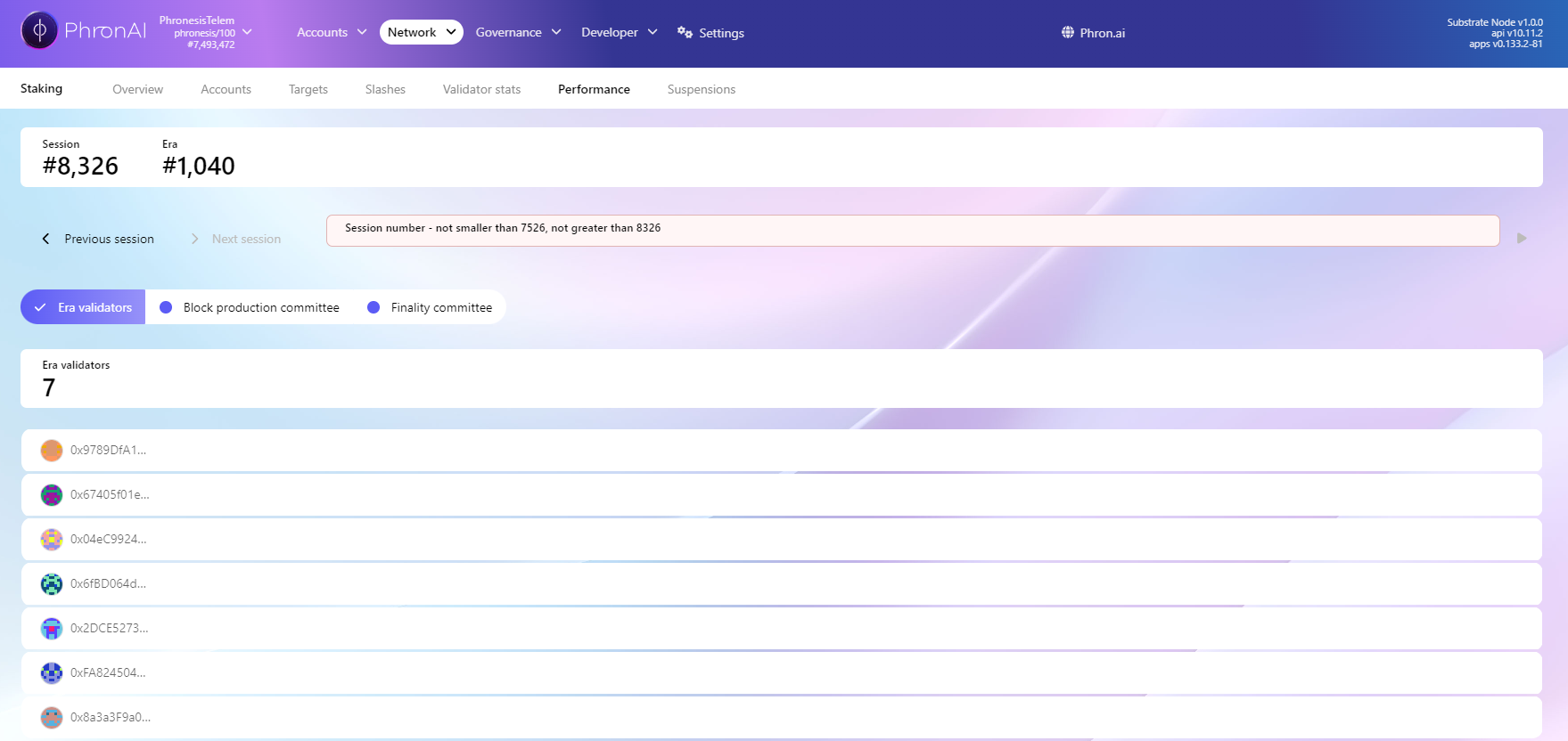 The Performance tab allows you to track the current session in real-time and analyze past sessions to see how many blocks each validator has created. This information is primarily of interest to validators, as the numbers do not directly indicate the rewards that validators or their nominators will receive. If you would like to explore this topic further, please refer to the Elections and Rewards Math section.