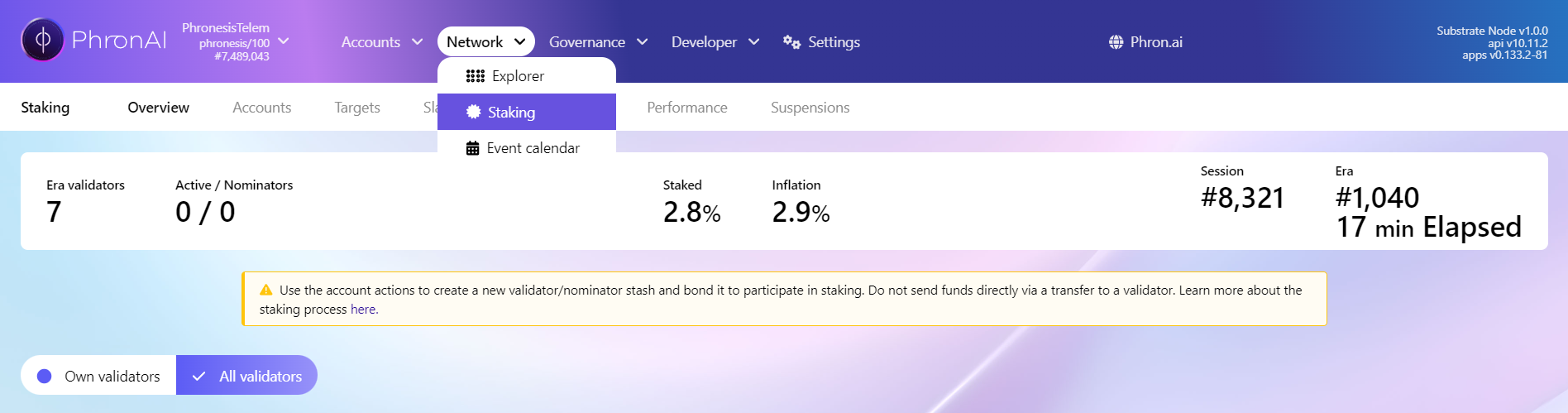 Overview of the Staking UI on dev.phron.ai