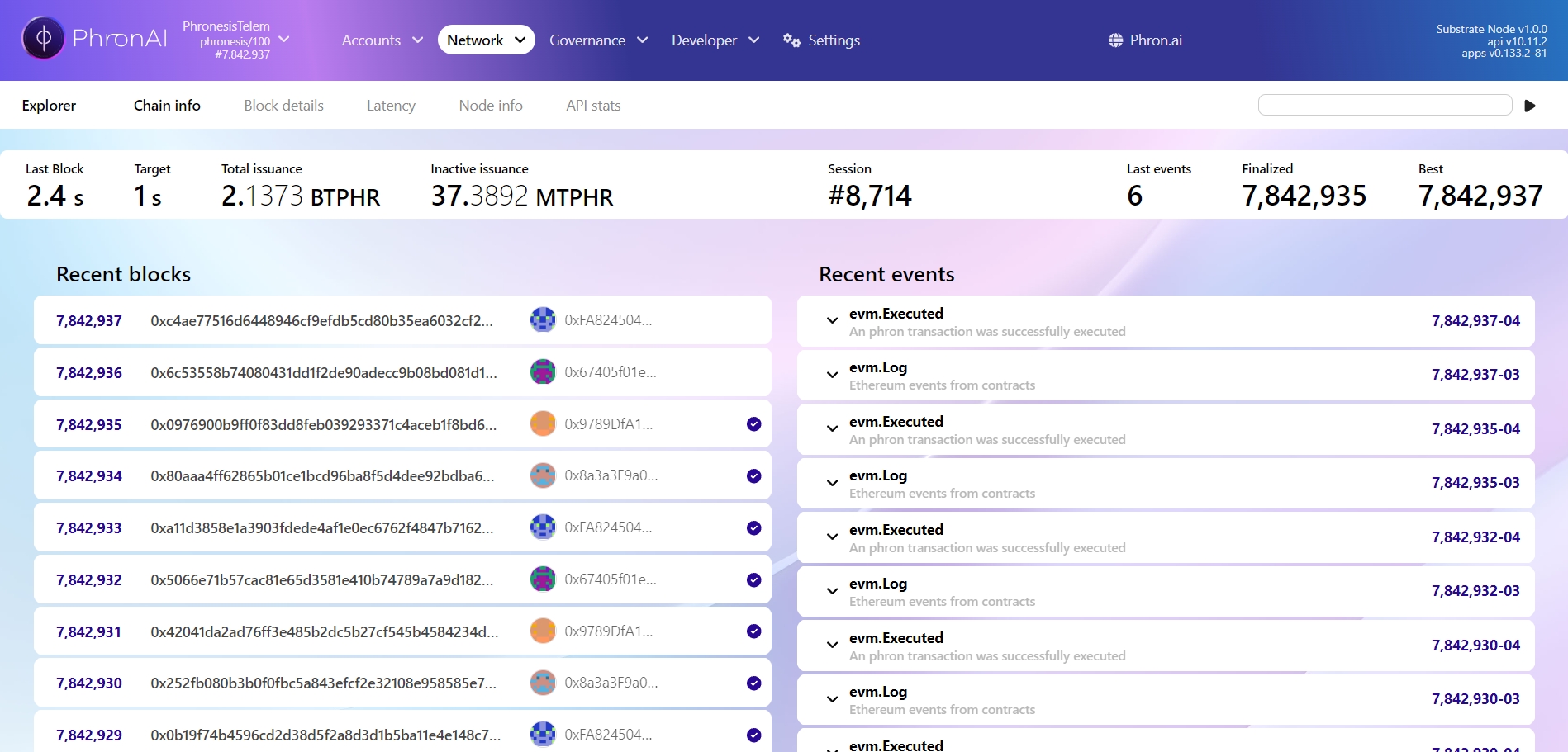 That's the default view of the Phron web wallet—a block explorer displaying the most recent blocks and events. To access all account-related actions, simply navigate to the Accounts tab, where you can manage your wallet, stake funds, and interact with other features of the Phron network.